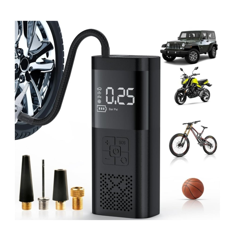Compressor de Ar Portátil Digital para Carros, Motos e BicicletasTenha sempre os seus pneus calibrados com este compressor de ar portátil e multifuncional. Compacto e leve, é ideal para encher pneus de carros, motos, bicicletas e até bolas desportivas. Perfeito para emergências ou para manter a pressão ideal nos seus pneus.CaracterísticasEcrã digital LED: Exibe a pressão em tempo real, facilitando o controlo preciso.Multifuncional: Inclui adaptadores para pneus, bolas e outros infláveis.Portátil e leve: Fácil de transportar e armazenar no carro ou em casa.Bateria recarregável: Uso sem fios com autonomia prolongada.Função de desligamento automático: Desliga ao atingir a pressão desejada.Iluminação SOS integrada: Útil em situações de emergência.