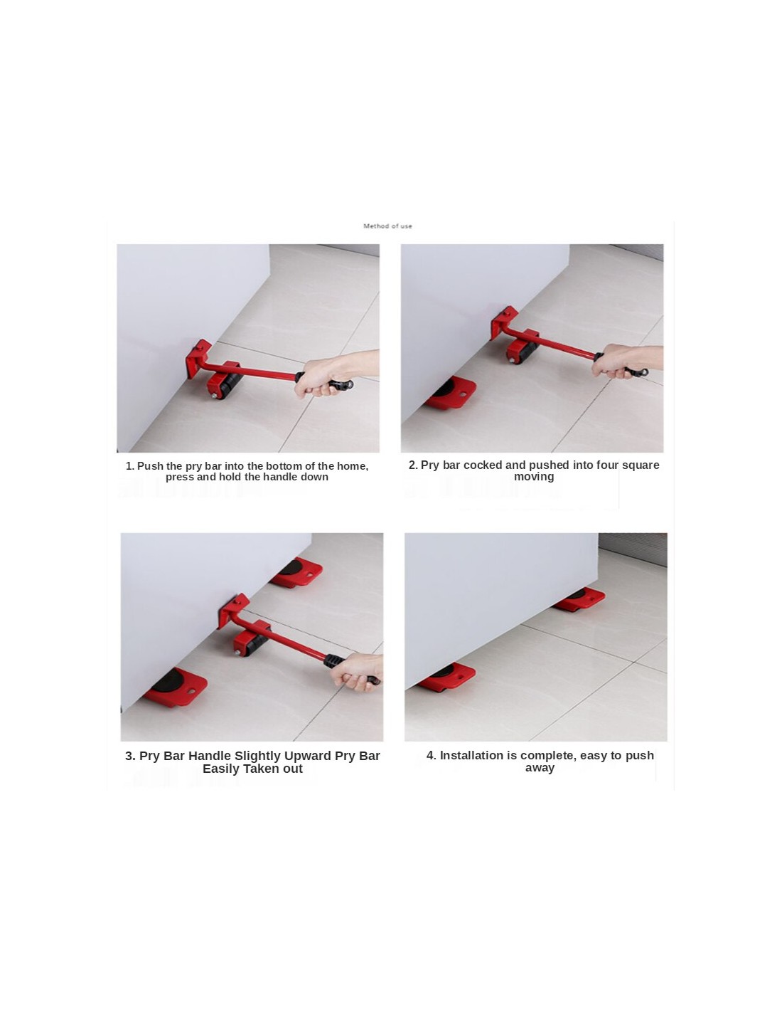 Kit de Ferramentas para Mover Móveis Pesados – Prático e EficienteEste Kit de Ferramentas para Mover Móveis Pesados é a solução ideal para quem precisa reorganizar a casa ou realizar mudanças sem esforço. Projetado para levantar e deslocar móveis pesados com facilidade e segurança, é indispensável para proteger o piso e evitar danos aos móveis.Características principais:Fácil de usar:Inclui uma alavanca ergonómica para levantar os móveis sem esforço.Design funcional:Suportes com rodas giratórias para uma movimentação suave e controlada.Material resistente:Fabricado em aço reforçado e plástico ABS durável, garantindo longa durabilidade.Versatilidade:Adequado para sofás, armários, mesas e outros móveis pesados.Proteção para o piso:Base antiderrapante que evita riscos no chão.Especificações técnicas:Material: Aço, plástico ABS e rodas de borrachaCapacidade máxima de peso: 150 kgCor: VermelhoInclui:1x Alavanca ergonómica4x Suportes móveis com rodasBenefícios do produto:Permite mover móveis sem precisar de ajuda extra, poupando tempo e esforço. Ideal para mudanças, limpeza ou reorganização de espaços, evitando lesões e protegendo o piso contra arranhões.